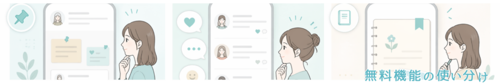 全部を無理に使う必要はありませんが、掲示板で見つけてもらい、つぶやきや日記で雰囲気や人柄を補強し、最後にプロフィールで判断される流れは相性が良いです。