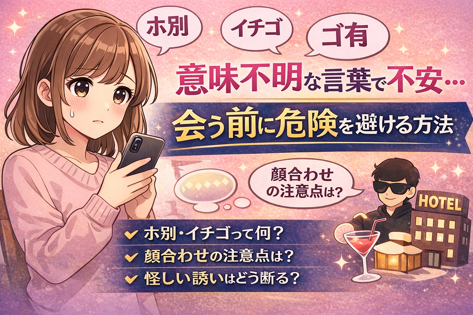- ホ別・イチゴ・顔合わせなどの意味を知って、会う前に危険を避けたい方