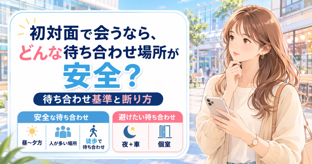 初対面で会う時に大事なのは、とにかく会うことではなく、危ない条件を通さないことです。マッチングアプリでも出会い系サイトでも共通する待ち合わせ基準、避けたい条件、言いにくい時の断り方を整理しました。