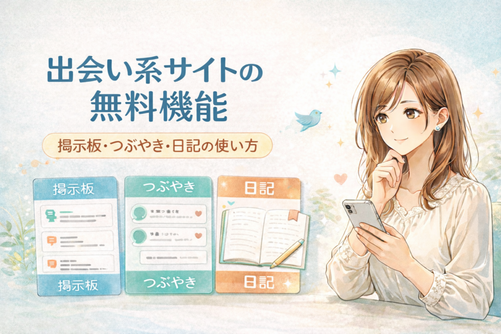 出会い系サイトの無料機能は、ただのおまけではありません。掲示板で見つけてもらい、つぶやきで軽い印象を作り、日記で人柄を補強することで、プロフィールだけでは足りない部分まで補えます。 -